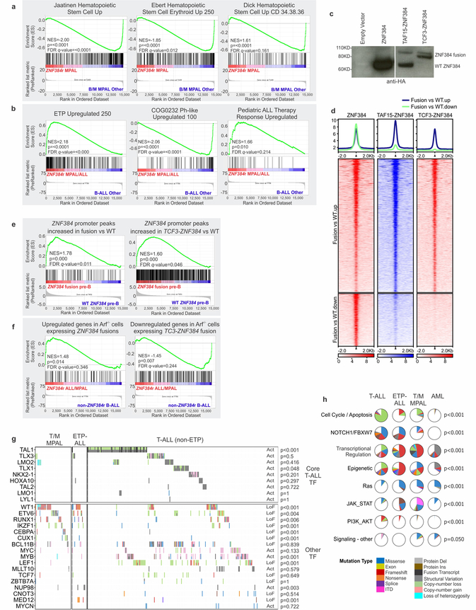 Mixed phenotype acute leukaemia (MPAL) is a high-risk subtype of leukaemia with myeloid and lymphoid features, limited genetic characterization, and a lack of consensus regarding appropriate therapy. Here we show that the two principal subtypes of MPAL, T/myeloid (T/M) and B/myeloid (B/M), are genetically distinct. Rearrangement of ZNF384 is common in B/M MPAL, and biallelic WT1 alterations are common in T/M MPAL, which shares genomic features with early T-cell precursor acute lymphoblastic leukaemia. We show that the intratumoral immunophenotypic heterogeneity characteristic of MPAL is independent of somatic genetic variation, that founding lesions arise in primitive haematopoietic progenitors, and that individual phenotypic subpopulations can reconstitute the immunophenotypic diversity in vivo. These findings indicate that the cell of origin and founding lesions, rather than an accumulation of distinct genomic alterations, prime tumour cells for lineage promiscuity. Moreover, these findings position MPAL in the spectrum of immature leukaemias and provide a genetically informed framework for future clinical trials of potential treatments for MPAL.