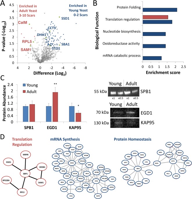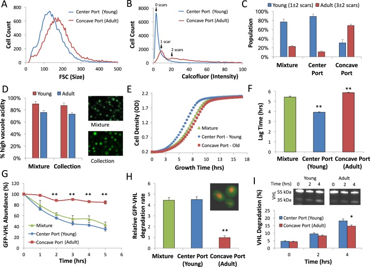 Microfluidic sorting offers a unique ability to isolate large numbers of cells for bulk proteomic or metabolomics studies but is currently limited by low throughput and persistent clogging at low flow rates. Recently we uncovered the physical principles governing the inertial focusing of particles in high-Reynolds numbers. Here, we superimpose high Reynolds inertial focusing on Dean vortices, to rapidly isolate large quantities of young and adult yeast from mixed populations at a rate of 107 cells/min/channel. Using a new algorithm to rapidly quantify budding scars in isolated yeast populations and system-wide proteomic analysis, we demonstrate that protein quality control and expression of established yeast aging markers such as CalM, RPL5, and SAM1 may change after the very first replication events, rather than later in the aging process as previously thought. Our technique enables the large-scale isolation of microorganisms based on minute differences in size (±1.5 μm), a feat unmatched by other technologies.