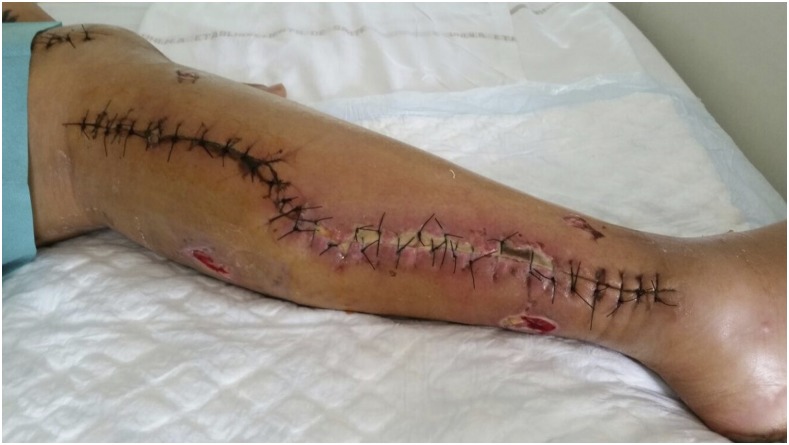 Bothrops lanceolatus is an endemic Crotalidae species in Martinique, where approximately 30 cases of envenoming are managed yearly. Envenoming characteristics from Bothrops species include local tissue damage, systemic bleeding, and hemodynamic alterations. We hereby report a case of severe envenomation following B. lanceolatus snakebite to the right calf. Severe local manifestations developed progressively up to the lower limb despite adequate antivenom therapy. Systemic manifestations of venom also occurred, resulting in intensive care therapy. Surgery exploration revealed soft tissue necrosis, friability of the deep fascia, and myonecrosis. The patient needed multiple debridement procedures and fasciotomy of all leg compartments and anterior compartment of the thigh. Diagnosis of necrotizing fasciitis was confirmed by positive Aeromonas hydrophila blood cultures. This clinical case illustrates that major soft tissue infection, including necrotizing fasciitis may occur after snakebite. Abnormal coagulation tests should not delay surgical management, as severe envenoming is a life-threatening condition.
