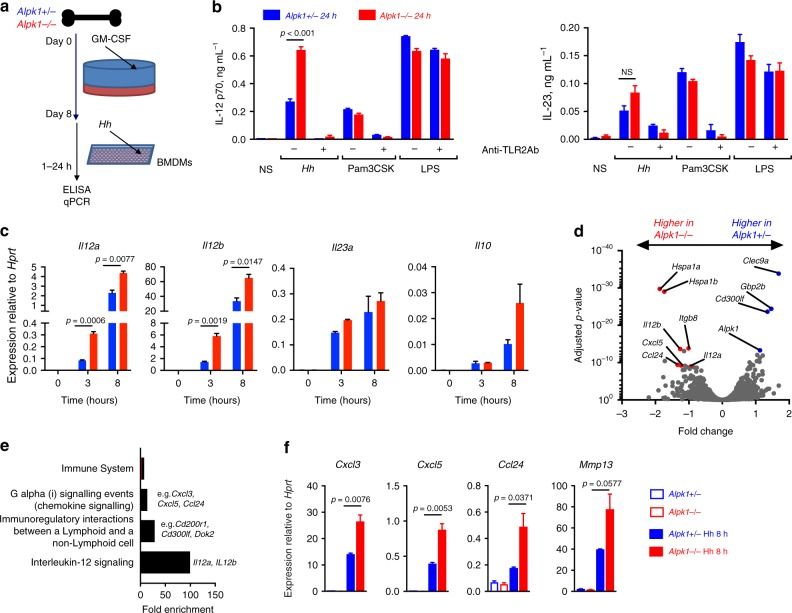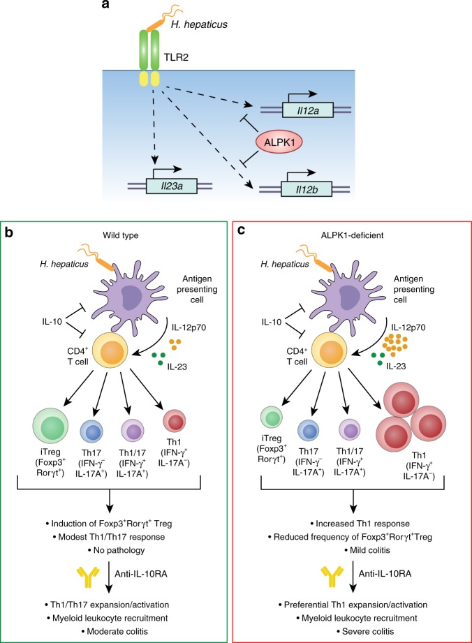 Inflammatory bowel disease (IBD) are heterogenous disorders of the gastrointestinal tract caused by a spectrum of genetic and environmental factors. In mice, overlapping regions of chromosome 3 have been associated with susceptibility to IBD-like pathology, including a locus called Hiccs. However, the specific gene that controls disease susceptibility remains unknown. Here we identify a Hiccs locus gene, Alpk1 (encoding alpha kinase 1), as a potent regulator of intestinal inflammation. In response to infection with the commensal pathobiont Helicobacter hepaticus (Hh), Alpk1-deficient mice display exacerbated interleukin (IL)-12/IL-23 dependent colitis characterized by an enhanced Th1/interferon(IFN)-γ response. Alpk1 controls intestinal immunity via the hematopoietic system and is highly expressed by mononuclear phagocytes. In response to Hh, Alpk1-/- macrophages produce abnormally high amounts of IL-12, but not IL-23. This study demonstrates that Alpk1 promotes intestinal homoeostasis by regulating the balance of type 1/type 17 immunity following microbial challenge.