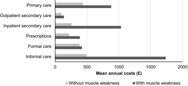 Sarcopenia and muscle weakness are responsible for considerable health care expenditure but little is known about these costs in the UK. To address this, we estimated the excess economic burden for individuals with muscle weakness regarding the provision of health and social care among 442 men and women (aged 71-80 years) who participated in the Hertfordshire Cohort Study (UK). Muscle weakness, characterised by low grip strength, was defined according to the Foundation for the National Institutes of Health criteria (men < 26 kg, women < 16 kg). Costs associated with primary care consultations and visits, outpatient and inpatient secondary care, medications, and formal (paid) as well as informal care for each participant were calculated. Mean total costs per person and their corresponding components were compared between groups with and without muscle weakness. Prevalence of muscle weakness in the sample was 11%. Mean total annual costs for participants with muscle weakness were £4592 (CI £2962-£6221), with informal care, inpatient secondary care and primary care accounting for the majority of total costs (38%, 23% and 19%, respectively). For participants without muscle weakness, total annual costs were £1885 (CI £1542-£2228) and their three highest cost categories were informal care (26%), primary care (23%) and formal care (20%). Total excess costs associated with muscle weakness were £2707 per person per year, with informal care costs accounting for 46% of this difference. This results in an estimated annual excess cost in the UK of £2.5 billion.
