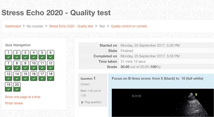 Results: All 60 readers were successfully accredited: 26 (43%) on first, 24 (40%) on second, and 10 (17%) on third attempt. The average diagnostic accuracy of the 60 accredited readers was 95%, with R value of 0.95 compared to reference standard reading. The 53 B-lines naive scored similarly to the 7 B-lines expert on first attempt (90 versus 95%, p = NS). Compared to the step-1 of quality control for regional wall motion abnormalities, the mean reading time per attempt was shorter (17 ± 3 vs 29 ± 12 min, p < .01), the first attempt success rate was higher (43 vs 28%, p < 0.01), and the drop-out of readers smaller (0 vs 28%, p < .01).