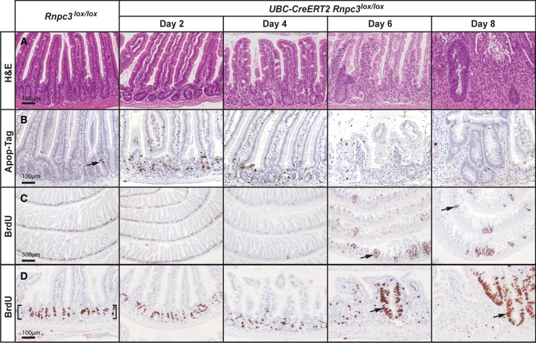 Splicing is an essential step in eukaryotic gene expression. While the majority of introns is excised by the U2-dependent, or major class, spliceosome, the appropriate expression of a very small subset of genes depends on U12-dependent, or minor class, splicing. The U11/U12 65K protein (hereafter 65K), encoded by RNPC3, is one of seven proteins that are unique to the U12-dependent spliceosome, and previous studies including our own have established that it plays a role in plant and vertebrate development. To pinpoint the impact of 65K loss during mammalian development and in adulthood, we generated germline and conditional Rnpc3-deficient mice. Homozygous Rnpc3-/- embryos died prior to blastocyst implantation, whereas Rnpc3+/- mice were born at the expected frequency, achieved sexual maturity, and exhibited a completely normal lifespan. Systemic recombination of conditional Rnpc3 alleles in adult (Rnpc3lox/lox ) mice caused rapid weight loss, leukopenia, and degeneration of the epithelial lining of the entire gastrointestinal tract, the latter due to increased cell death and a reduction in cell proliferation. Accompanying this, we observed a loss of both 65K and the pro-proliferative phospho-ERK1/2 proteins from the stem/progenitor cells at the base of intestinal crypts. RT-PCR analysis of RNA extracted from purified preparations of intestinal epithelial cells with recombined Rnpc3lox alleles revealed increased frequency of U12-type intron retention in all transcripts tested. Our study, using a novel conditional mouse model of Rnpc3 deficiency, establishes that U12-dependent splicing is not only important during development but is indispensable throughout life.