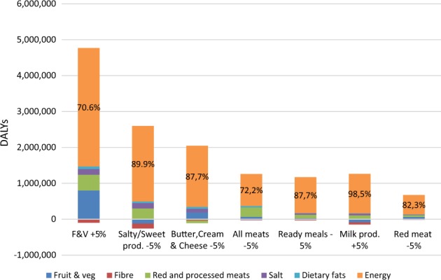 Results: A recommendation, when adopted by consumers, generates important changes in the whole diet due to substitutions and complementarities among foods. All simulated recommendations have a positive impact on health. The F&V recommendation has the largest impact on the number of DALYs averted, but the highest adoption cost for consumers, especially for low-income consumers. Alone, the change in energy intake explains from 71% to 98% of the DALYs averted induced by a recommendation.