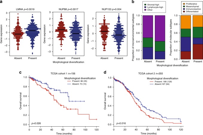 How tumor microenvironmental forces shape plasticity of cancer cell morphology is poorly understood. Here, we conduct automated histology image and spatial statistical analyses in 514 high grade serous ovarian samples to define cancer morphological diversification within the spatial context of the microenvironment. Tumor spatial zones, where cancer cell nuclei diversify in shape, are mapped in each tumor. Integration of this spatially explicit analysis with omics and clinical data reveals a relationship between morphological diversification and the dysregulation of DNA repair, loss of nuclear integrity, and increased disease mortality. Within the Immunoreactive subtype, spatial analysis further reveals significantly lower lymphocytic infiltration within diversified zones compared with other tumor zones, suggesting that even immune-hot tumors contain cells capable of immune escape. Our findings support a model whereby a subpopulation of morphologically plastic cancer cells with dysregulated DNA repair promotes ovarian cancer progression through positive selection by immune evasion.