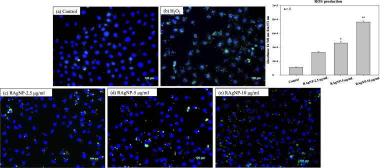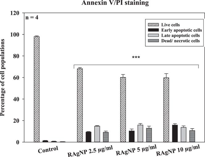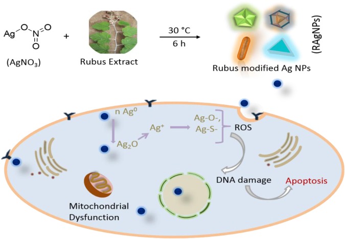 Metallic nanoparticles (NPs) especially silver (Ag) NPs have shown immense potential in medical applications due to their distinctive physio-chemical and biological properties. This article reports the conjugation of Ag NPs with Rubus fairholmianus extract. The modification of Ag NPs was confirmed using various physico-chemical characterization techniques. The cytotoxic effect of Rubus-conjugated Ag NPs (RAgNPs) was studied by LDH assay and proliferation by ATP assay. The apoptotic inducing ability of the NPs were investigated by Annexin V/PI staining, caspase 3/7 analysis, cytochrome c release, intracellular ROS analysis, Hoechst staining and mitochondrial membrane potential analysis using flow cytometry. The expression of apoptotic proteins caspase 3, Bax and P53 were analyzed using ELISA and caspase 3, Bax using western blotting. Cells treated with 10 µg/mL RAgNPs showed an increased number of cell death by microscopic analysis compared to untreated control cells. The RAgNPs induced a statistically significant dose-dependent decrease in proliferation (p < 0.001 for 5 and 10 µg/mL) and increased cytotoxicity in MCF-7 cells. A 1.83 fold increase in cytotoxicity was observed in cells treated with 10 µg/mL (p < 0.05) compared to the untreated cells. Nuclear damage and intracellular ROS production were observed upon treatment with all tested concentrations of RAgNPs and the highest concentrations (5 and 10 µg/mL) showed significant (p < 0.05, p < 0.01) expression of caspase 3, Bax and P53 proteins. The data strongly suggest that RAgNPs induces cell death in MCF-7 cells through the mitochondrial-mediated intrinsic apoptosis pathway. The present investigation supports the potential of RAgNPs in anticancer drug development.