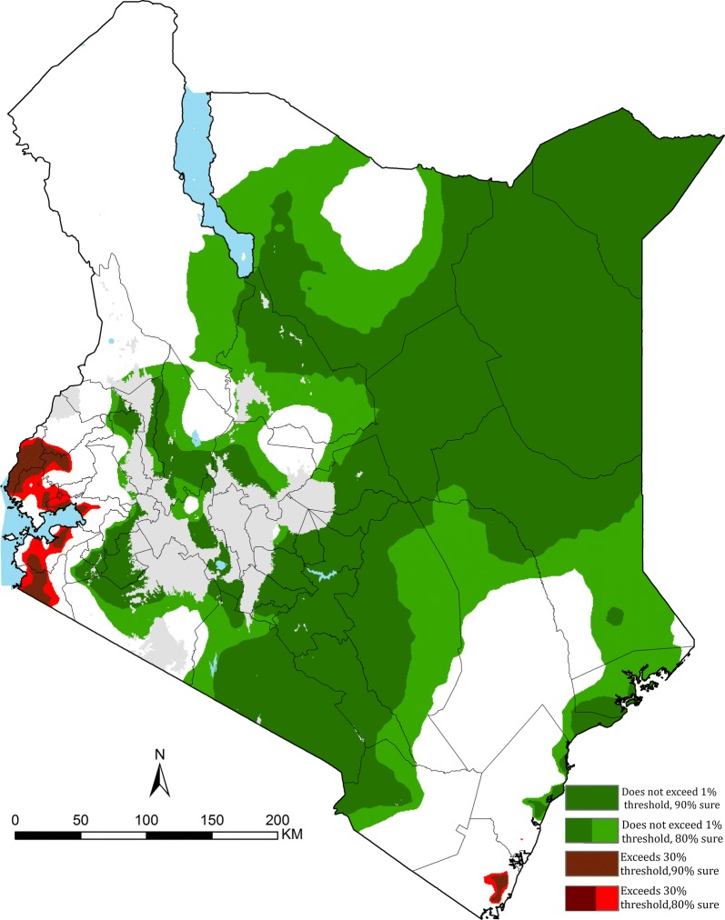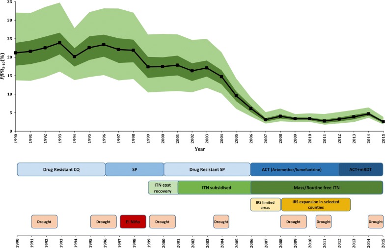 Methods: Plasmodium falciparum parasite prevalence (PfPR) surveys undertaken in Kenya between 1980 and 2015 were assembled. A spatio-temporal geostatistical model was fitted to predict annual malaria risk for children aged 2-10 years (PfPR2-10) at 1 × 1 km spatial resolution from 1990 to 2015. Changing PfPR2-10 was compared against plausible explanatory variables. The fitted model was used to categorize areas with varying degrees of prediction probability for two important policy thresholds PfPR2-10 < 1% (non-exceedance probability) or ≥ 30% (exceedance probability).
