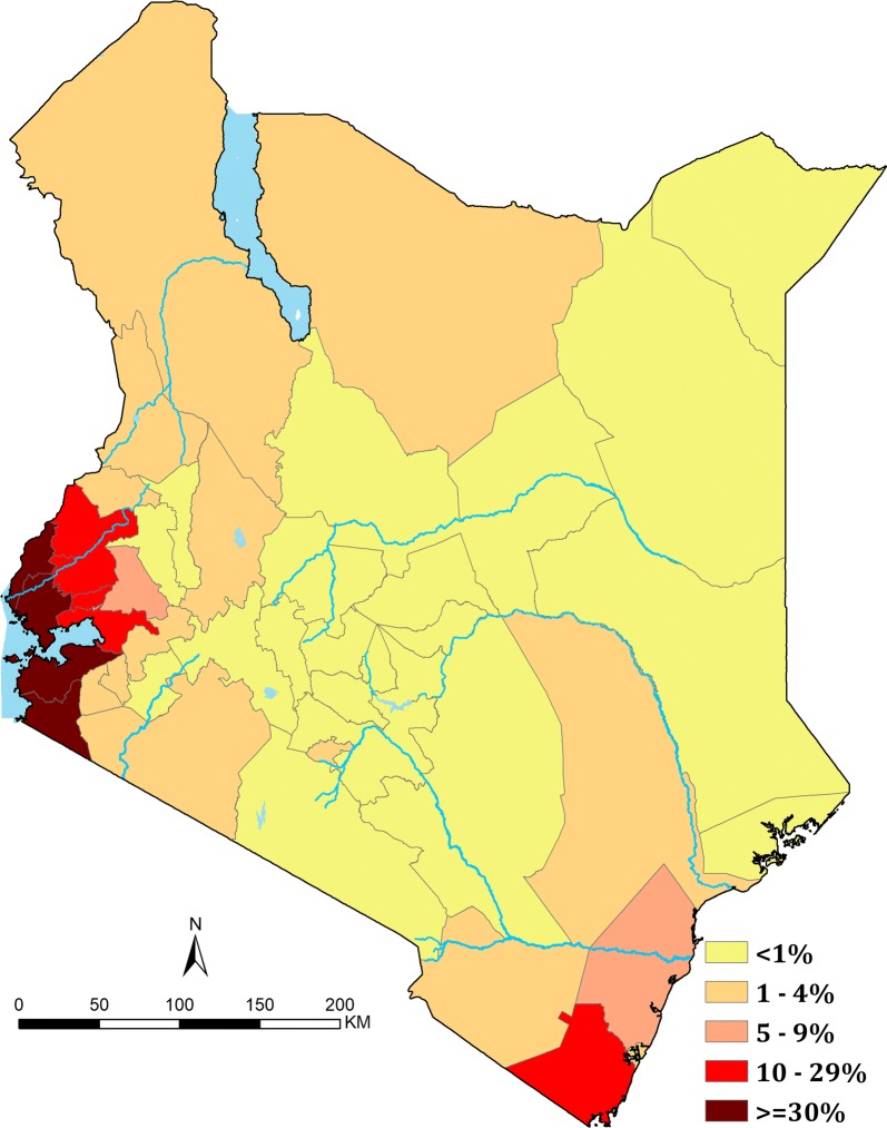 Results: 5020 surveys at 3701 communities were assembled. Nationally, there was an 88% reduction in the mean modelled PfPR2-10 from 21.2% (ICR: 13.8-32.1%) in 1990 to 2.6% (ICR: 1.8-3.9%) in 2015. The most significant decline began in 2003. Declining prevalence was not equal across the country and did not directly coincide with scaled vector control coverage or changing therapeutics. Over the period 2013-2015, of Kenya's 47 counties, 23 had an average PfPR2-10 of < 1%; four counties remained ≥ 30%. Using a metric of 80% probability, 8.5% of Kenya's 2015 population live in areas with PfPR2-10 ≥ 30%; while 61% live in areas where PfPR2-10 is < 1%.