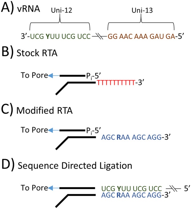For the first time, a coding complete genome of an RNA virus has been sequenced in its original form. Previously, RNA was sequenced by the chemical degradation of radiolabeled RNA, a difficult method that produced only short sequences. Instead, RNA has usually been sequenced indirectly by copying it into cDNA, which is often amplified to dsDNA by PCR and subsequently analyzed using a variety of DNA sequencing methods. We designed an adapter to short highly conserved termini of the influenza A virus genome to target the (-) sense RNA into a protein nanopore on the Oxford Nanopore MinION sequencing platform. Utilizing this method with total RNA extracted from the allantoic fluid of influenza rA/Puerto Rico/8/1934 (H1N1) virus infected chicken eggs (EID50 6.8 × 109), we demonstrate successful sequencing of the coding complete influenza A virus genome with 100% nucleotide coverage, 99% consensus identity, and 99% of reads mapped to influenza A virus. By utilizing the same methodology one can redesign the adapter in order to expand the targets to include viral mRNA and (+) sense cRNA, which are essential to the viral life cycle, or other pathogens. This approach also has the potential to identify and quantify splice variants and base modifications, which are not practically measurable with current methods.
