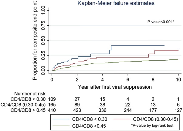 Results: A total of 800 ART-naïve patients with baseline CD4/CD8 ratio of < 0.8 who started combination ART, and had sustained virological suppression were enrolled. Participants were on ART for a median of 8.9 years and virologically suppressed for 6.1 years. The probabilities of CD4/CD8 normalization at 2, 5 and 10 years after virological suppression were 5.1%, 18.6% and 39.1%, respectively. Factors associated with normalization in multivariate analysis were female sex (hazard ratio [HR]: 2.47, 95% CI 1.71-3.56, p < 0.001) and baseline CD4 counts ≥ 350 cells/mm3 (HR: 3.62, 95% CI 2.36-5.55), p < 0.001) vs. < 200 cells/mm3 as reference. The second analysis explored the predictive value of CD4/CD8 ratio for NAEs. Older age (HR: 1.09, 95% CI 1.05-1.13, p < 0.01) and current CD4/CD8 ratio < 0.3 (HR: 3.02, 95% CI 1.27-7.21, p = 0.01) or between 0.3 and 0.45 (HR: 2.03, 95% CI 1.03-3.98, p = 0.04) vs. > 0.45 were independently associated with higher risk of progression to NAEs in the multivariate analysis.