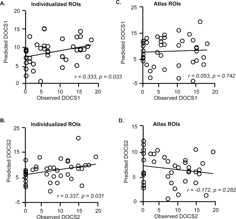 Methods: We used functional regions, localized in each of 41 individual OCD patients, to identify cortical connectivity biomarkers of both global and dimension-specific symptom severity and to detect functional connections that track changes in symptom severity following intensive residential treatment.