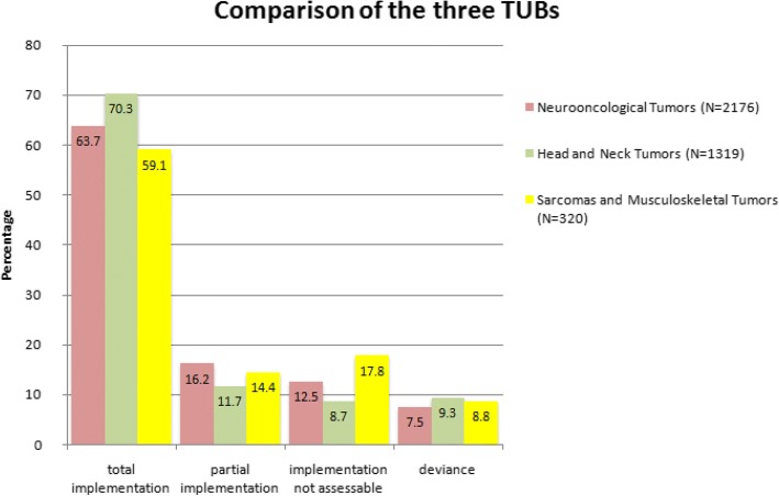 Results: The study showed that 80.1% of all recommendations in the three TUBs were implemented. 8.3% of all recommendations showed a deviance. Most important reasons for the deviances were patient wish (36.5%), patient death (26%) and doctoral decision, due to the patient's comorbidities or side effects of the treatment (24.1%).Interestingly, deviance in all three tumor boards in total significantly decreased over time.