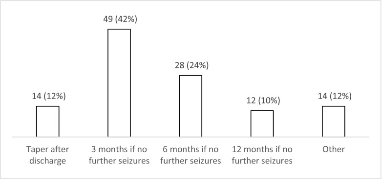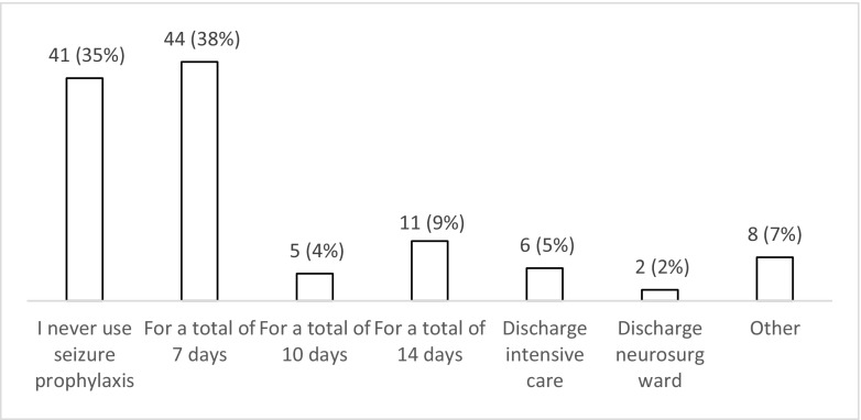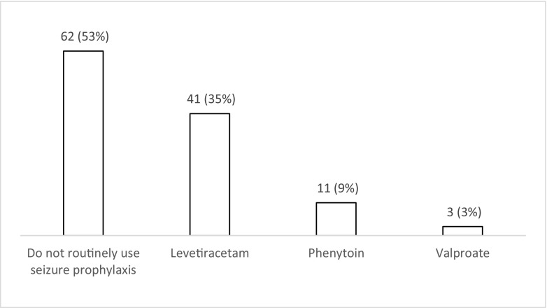 Results: One hundred and seventeen respondents answered the questionnaire, predominantly neurosurgeons (76%) from 30 (of 32) trauma-receiving hospitals in the UK and Ireland. Fifty-three percent of respondents do not routinely use seizure prophylaxis, but 38% prescribe prophylaxis for one week. Sixty percent feel there is uncertainty regarding the use of seizure prophylaxis, and 71% would participate in further research to address this question. Sixty-two percent of respondents use levetiracetam for treatment of seizures during the acute phase, and 42% continued for a total of 3 months. Overall, 90% were uncertain about the duration of treatment for seizures, and 78% would participate in further research to address this question.