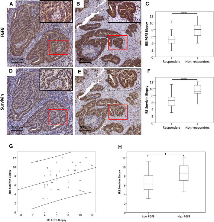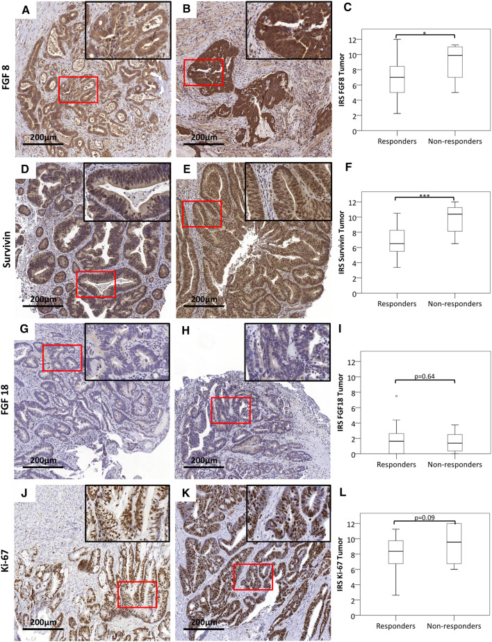 Results: Our findings revealed significantly higher FGF8 and Survivin staining scores in pre-treatment biopsies as well as in surgical specimens of non-responsive compared to responsive patients. Functional studies demonstrated dose-dependent induction of FGF8 mRNA expression in mismatch-incompetent DLD1 cells already after one dose of irradiation. Surviving clones after one or two series of radiation were more resistant to an additional radiation fraction than non-irradiated controls and showed a significant increase in expression of the FGF8 receptor FGFR3 and of Survivin on both the RNA and the protein levels.