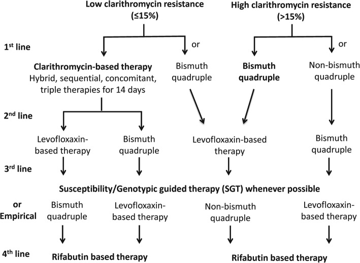 In the face of rising prevalence of antibiotic resistance, susceptibility testing to provide personalized treatment is recommended prior to eradication therapy for Helicobacter pylori (H. pylori). Yet, population specific treatment according to the local prevalence of antibiotic resistance may be an alternative if susceptibility testing is not available. In this article, we reviewed the global prevalence of primary antibiotic resistance and the efficacies of commonly used regimens in antibiotic susceptible and resistance strains. We then constructed a model to predict the efficacies of these regimens and proposed an algorithm to choose the optimal first-line and rescue therapies according to the prevalence of antibiotic resistance. Clarithromycin-based therapy (triple, sequential, concomitant, and hybrid therapies) for 14 days remains the treatment of choice in regions with low clarithromycin resistance (≤15%) and bismuth quadruple therapy may be an alternative therapy. In regions with high clarithromycin resistance (> 15%), bismuth quadruple therapy is the treatment of choice and non-bismuth quadruple therapy may be an alternative. Either levofloxacin-based therapy or bismuth quadruple therapy may be used as second-line rescue therapy for patients fail after clarithromycin-based therapies, whereas levofloxacin-based therapy may be used for patients fail after bismuth quadruple therapy. Susceptibility testing or genotypic resistance should be determined after two or more eradication failures. However, empirical therapy according to prior medication history to avoid the empirical reuse of levofloxacin and clarithromycin may be an acceptable alternative after consideration of cost, patient preference, and accessibility. Rifabutin-based therapy for 14 days may serve as the fourth-line therapy. New antibiotics specific for H. pylori are highly anticipated.