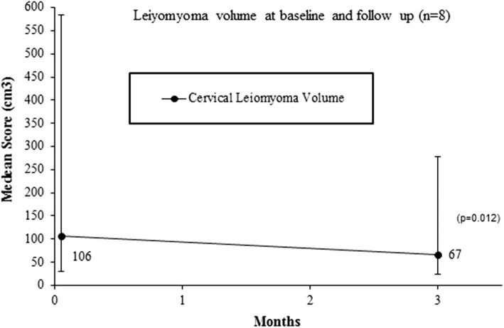 Results: Between 2006 and 2017, eight of 1180 patients underwent UAE and were eligible for inclusion. All embolizations were technically successful (n = 8). At 3 months, all patients showed cervical leiomyomata volume reduction with a median reduction of 41.5% (38.8 cm3) compared to baseline (p = 0.012). No complications occurred. At a median follow-up of 3 months (range 1-7, n = 7), the HRQOL and SSS improved with a median difference of 13 points (range - 5 to 60, p = 0.063) and - 13 points (range - 79 to 3, p = 0.046), respectively. Long-term follow-up showed two secondary interventions (median of 43.5 months). Six patients reported no symptom recurrence.