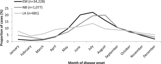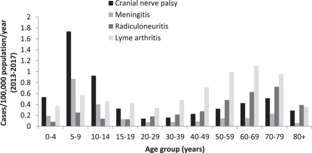 Lyme borreliosis (LB) is the most commonly reported tick-borne disease in Germany. In 9/16 states, notification of erythema migrans (EM), acute neuroborreliosis (NB) and Lyme arthritis (LA) is mandatory. We describe incidence measures, time trends, geographical distribution and frequencies of manifestations to better understand LB epidemiology and target prevention measures. We used cases notified in the 9 states and confirmed by local health offices, 2013-2017, to calculate incidences by time, place and person. Altogether, we observed 56,446 cases. Disease onset peaked yearly in July. Incidence ranged from 26/100,000 (2015) to 41/100,000 (2013) with mean annual incidences 2013-2017 on district level between 0.5/100,000 and 138/100,000. Median age was 54 years with peaks in boys (5-9 years, mean incidence 36/100,000) and women (50-69 years, mean incidence 57/100,000). 95% experienced EM only, 2.7% NB and 2.1% LA. 54% were female, but more men had NB (56%) and LA (53%, p < 0.001). Hospitalisation was recorded for 10% of LA and 71% of NB cases. LB remains an important public health concern in Germany with marked regional variation. To facilitate early diagnosis and treatment, health authorities should raise awareness among physicians and promote prevention strategies among the general population: tick-bite-protection, prompt tick removal and medical consultation.