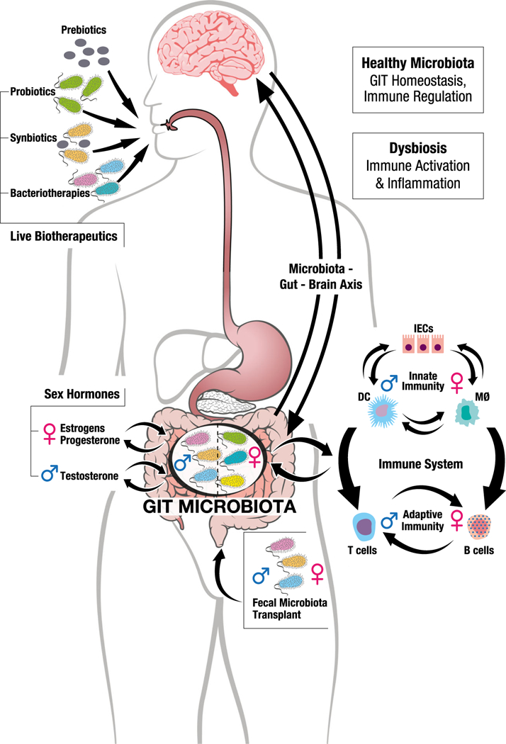 Keywords: Adaptive immunity; Bacteriotherapy; Faecal microbiota transplant; Innate immunity; Probiotics; Sex differences; Sex hormones.