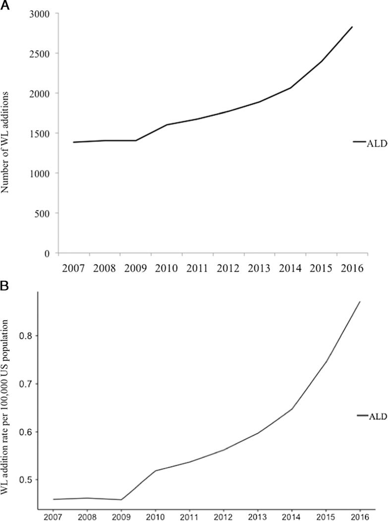 Methods: Using the United Network for Organ Sharing registry, we examined temporal trends in adult liver transplant waitlist (WL) registrants and recipients with chronic liver disease (CLD) due to ALD from 2007 to 2016.