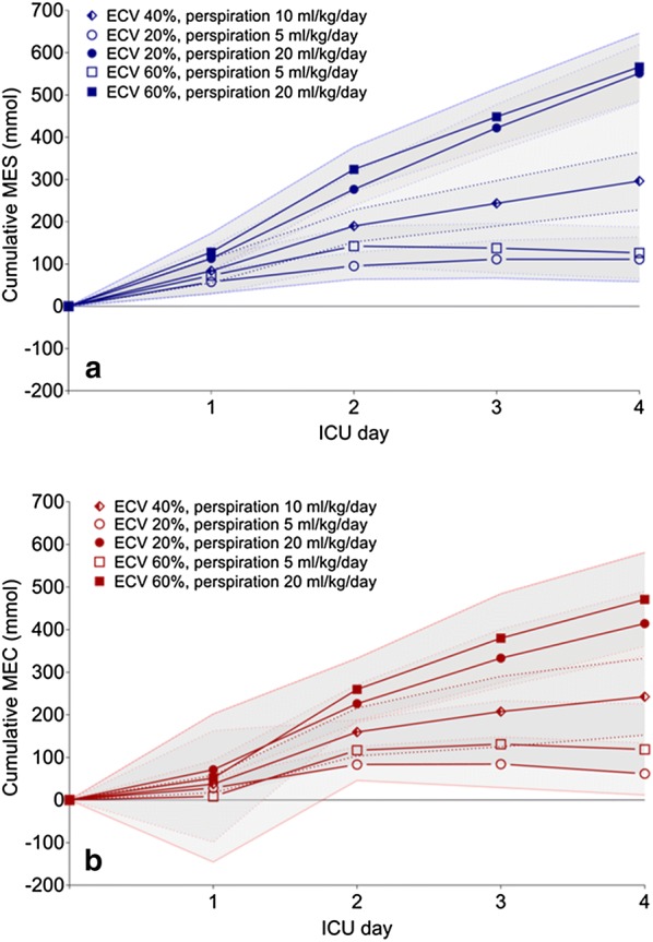 Results: A total of 38 patients with 152 consecutive ICU days were analyzed. In our default scenario, we could not account for 296 ± 35 mmol of MES in the first four ICU days. The range of observed MES in the five scenarios varied from 111 ± 27 to 566 ± 41 mmol (P < 0.001). A cumulative value of 243 ± 46 mmol was calculated for MEC in the default scenario. The range of cumulative MEC was between 62 ± 27 and 471 ± 56 mmol (P = 0.001 and P = 0.003). MES minus MEC varied from 1 ± 51 to 123 ± 33 mmol in the five scenarios.