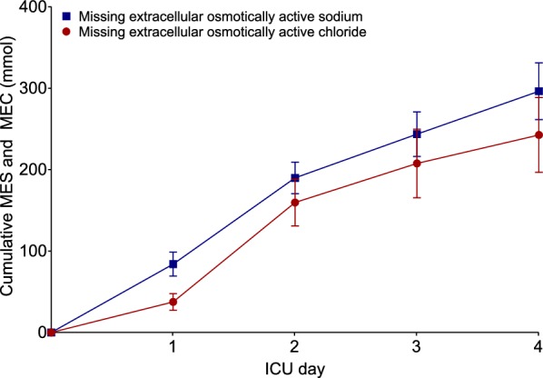 Conclusions: Our study suggests considerable disappearance of osmotically active sodium in critically ill patients and is the first to also suggest rather similar disappearance of chloride from the extracellular space. Various scenarios for insensible water loss and estimated size for the ECV resulted in considerable MES and MEC, although these estimates showed a large variation. The mechanisms and the tissue compartments responsible for this phenomenon require further investigation.