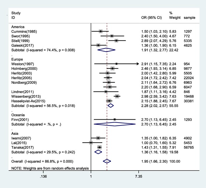 Results: Data were extracted from 19 studies involving 232,703 patients. Firstly, pooled odds ratio (OR) from 16 cohort studies showed that BCPR was associated with improved chance of survival of OHCAs compared with NO-BCPR (OR 1.95, 95% confidence interval [CI]: 1.66-2.30). Secondly, from 8 cohort studies of OHCAs whose initial rhythm is limited, the pooled OR was 2.10 (95% CI, 1.68-2.63) of 6 articles for shockable rhythm and 1.07 (95% CI, 0.37-3.13) of 2 articles for non-shockable rhythm. Meta-regression showed a relation between the survival of OHCAs and BCPR was influenced by area (p < 0.05).