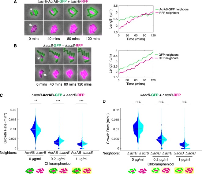 Cell-cell interactions play an important role in bacterial antibiotic resistance. Here, we asked whether neighbor proximity is sufficient to generate single-cell variation in antibiotic resistance due to local differences in antibiotic concentrations. To test this, we focused on multidrug efflux pumps because recent studies have revealed that expression of pumps is heterogeneous across populations. Efflux pumps can export antibiotics, leading to elevated resistance relative to cells with low or no pump expression. In this study, we co-cultured cells with and without AcrAB-TolC pump expression and used single-cell time-lapse microscopy to quantify growth rate as a function of a cell's neighbors. In inhibitory concentrations of chloramphenicol, we found that cells lacking functional efflux pumps (ΔacrB) grow more slowly when they are surrounded by cells with AcrAB-TolC pumps than when surrounded by ΔacrB cells. To help explain our experimental results, we developed an agent-based mathematical model, which demonstrates the impact of neighbors based on efflux efficiency. Our findings hold true for co-cultures of Escherichia coli with and without pump expression and also in co-cultures of E. coli and Salmonella typhumirium. These results show how drug export and local microenvironments play a key role in defining single-cell level antibiotic resistance.