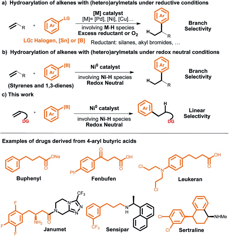 Nickel(0)-catalyzed linear-selective hydroarylation of unactivated alkenes and styrenes with aryl boronic acids