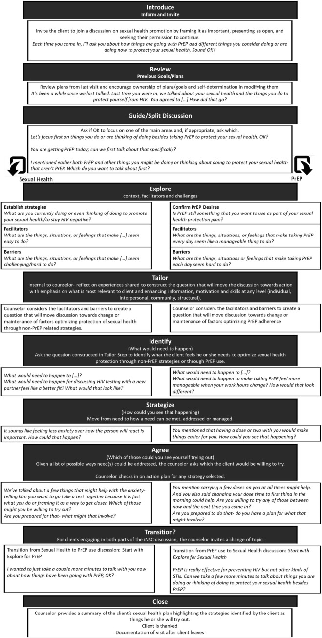 Pre-exposure prophylaxis (PrEP) for the prevention of HIV infection among young men who have sex with men is a critical part of the HIV prevention landscape in the US. Given the unique challenges and resources of young MSM negotiating safer sex practices, including PrEP, counseling and supportive discussions to optimize both PrEP use and sexual health protection more generally may facilitate reaching HIV prevention goals. Within the context of a large, open-label PrEP study (ATN110/113), support for sexual health promotion and PrEP use was provided through use of integrated Next Step Counseling (iNSC) as part of study visits. We detail iNSC and, using session documentation collected throughout this study, we characterize iNSC implementation and the content generated from these discussions. We detail features of iNSC, training of counselors and the implementation of iNSC in a multi-site PrEP study with young MSM in the US. Case report forms completed by iNSC counselors at study visits at weeks 4, 8, 12, 24, 36, and 48 were evaluated. Implementation of each intervention step for each discussion is summarized at and across timepoints, as well as features of specific steps (e.g., kinds of facilitators and barriers). Implementation differences by group (e.g., race/ethnicity, age) were examined. iNSC case report forms from 1000 sessions involving 178 unique participants ages 15-22 from sessions conducted between 2013 and 2015 were reviewed. High fidelity to iNSC steps in terms of inclusion in sessions was reported; 98-100% of sessions included critical steps for sexual health protection discussions and 96-98% for PrEP use discussions. The vast majority of sessions appeared to flow in line with iNSC's emphasis on exploration and open discussion prior to considering specific needs and related strategies. Nearly three-quarters of sessions noted 'commitment to staying negative' as a motivator towards sexual health protection (more commonly reported by those identifying as White), while 'assuming partner is negative' was the most common challenge (less common for the older cohort), and 'having access' to a sexual health protection tool or strategy (besides PrEP) was the most common "need" (more common for those identifying as White or Latino). Carrying dose(s) to have them on-hand when needed was the most common PrEP adherence facilitator, drug and alcohol use was the most common challenge noted, and access to a dose when needed was the most common "need" (more common for participants self-identified as White). iNSC was implemented consistently throughout ATN110/113, and patient-centered discussions about sexual health protection and PrEP-use appeared feasible to incorporate into clinical care visits.