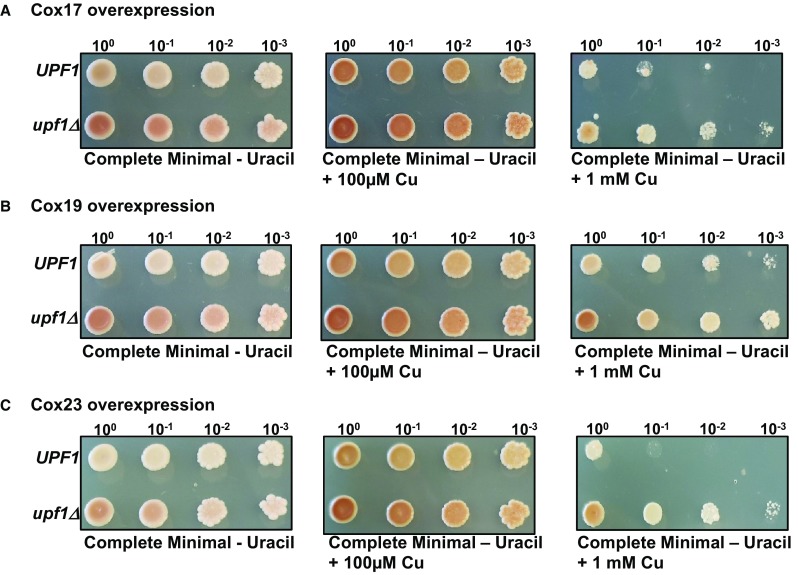 The differential regulation of COX17, COX19 and COX23 mRNAs by the nonsense-mediated mRNA decay (NMD) pathway was investigated. The NMD pathway regulates mRNAs that aberrantly terminate translation. This includes mRNAs harboring premature translation termination codons and natural mRNAs. Most natural mRNAs regulated by NMD encode fully functional proteins involved in various cellular processes. However, the cause and targeting of most of these mRNAs by the pathway is not understood. Analysis of a set of mRNAs involved in copper homeostasis showed that a subset of these mRNAs function in mitochondrial copper homeostasis. Here, we examined the regulation of COX17, COX19 and COX23 mRNAs by NMD. These mRNAs encode homologous mitochondrial proteins involved in metallation of cytochrome c oxidase. We found that COX17, COX19 and COX23 mRNAs are differentially regulated by NMD depending on environmental copper levels. A long 3'-UTR contributes to the direct regulation of COX19 mRNA by the pathway. Alternatively, COX23 mRNA contains a long 3'-UTR, but is indirectly regulated by the pathway under two conditions tested here. Analysis of the functionality of the NMD targeting features in COX23 mRNA showed that the COX23 3'-UTR is sufficient to trigger NMD. The regulation of mRNAs involved in mitochondrial copper metabolism by NMD is physiologically significant because excess copper enhances growth of NMD mutants on a non-fermentable carbon source. These findings suggest that regulation of mRNAs encoding homologous proteins by NMD can be differential depending on environmental copper levels. Furthermore, these findings suggest copper ion homeostatic mechanisms in the mitochondria occur at the mRNA level via the NMD pathway.