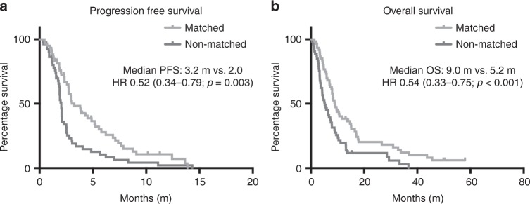 Results: A total of 97 consecutive patients with MBC were enrolled onto ≥1 trial between 2009 and 2015. Fourteen patients participated in multiple trials, and a total of 113 trial encounters were reviewed in this retrospective study. Eighty-three percent of patients with molecular data available were able to participate in trials matched to molecular aberrations. Patients who were treated on matched studies had improved clinical benefit (RR: 1.80, p = 0.005), progression-free (HR: 0.52, p = 0.003) and overall survival (HR: 0.54, p < 0.001). Treatment was well tolerated with low rates of treatment discontinuation for toxicity (8% overall) that did not differ between groups. No toxicity-related deaths were observed.