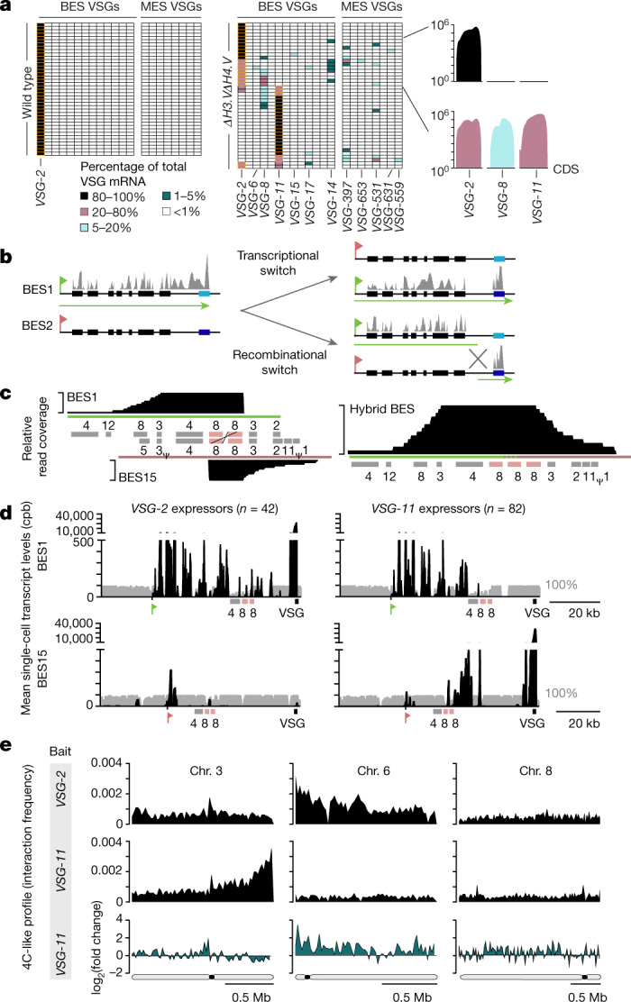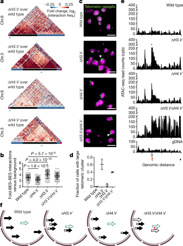 Many evolutionarily distant pathogenic organisms have evolved similar survival strategies to evade the immune responses of their hosts. These include antigenic variation, through which an infecting organism prevents clearance by periodically altering the identity of proteins that are visible to the immune system of the host1. Antigenic variation requires large reservoirs of immunologically diverse antigen genes, which are often generated through homologous recombination, as well as mechanisms to ensure the expression of one or very few antigens at any given time. Both homologous recombination and gene expression are affected by three-dimensional genome architecture and local DNA accessibility2,3. Factors that link three-dimensional genome architecture, local chromatin conformation and antigenic variation have, to our knowledge, not yet been identified in any organism. One of the major obstacles to studying the role of genome architecture in antigenic variation has been the highly repetitive nature and heterozygosity of antigen-gene arrays, which has precluded complete genome assembly in many pathogens. Here we report the de novo haplotype-specific assembly and scaffolding of the long antigen-gene arrays of the model protozoan parasite Trypanosoma brucei, using long-read sequencing technology and conserved features of chromosome folding4. Genome-wide chromosome conformation capture (Hi-C) reveals a distinct partitioning of the genome, with antigen-encoding subtelomeric regions that are folded into distinct, highly compact compartments. In addition, we performed a range of analyses-Hi-C, fluorescence in situ hybridization, assays for transposase-accessible chromatin using sequencing and single-cell RNA sequencing-that showed that deletion of the histone variants H3.V and H4.V increases antigen-gene clustering, DNA accessibility across sites of antigen expression and switching of the expressed antigen isoform, via homologous recombination. Our analyses identify histone variants as a molecular link between global genome architecture, local chromatin conformation and antigenic variation.
