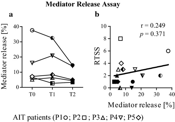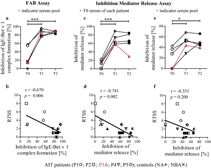 Results: There was no correlation between NPT results and therapy-induced changes in levels (IgE, IgG, IgA, IgM), avidities, or mediator release potency of Bet v 1-specific antibodies. In FAB assays, blocking antibodies initiated upon AIT were shown to prevent formation of Bet v 1-IgE complexes of an indicator serum pool and significantly correlated with clinical readout. Inhibition mediator release assays using patient-specific IgE for passive sensitization revealed therapy-induced blocking capacities with very good correlation to NPT results. Notably, this assay was the only one to detect a non-responder during treatment in this pilot study.