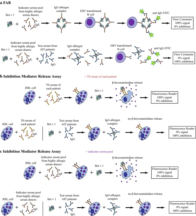 Conclusions: Clinical outcome of AIT depends on induction of blocking antibodies able to prevent the patient's own IgE from allergen binding. Monitoring of clinical efficacy seems to be best achieved using the inhibition mediator release assay, as development of relevant blocking antibodies can be verified in a patient-tailored manner.