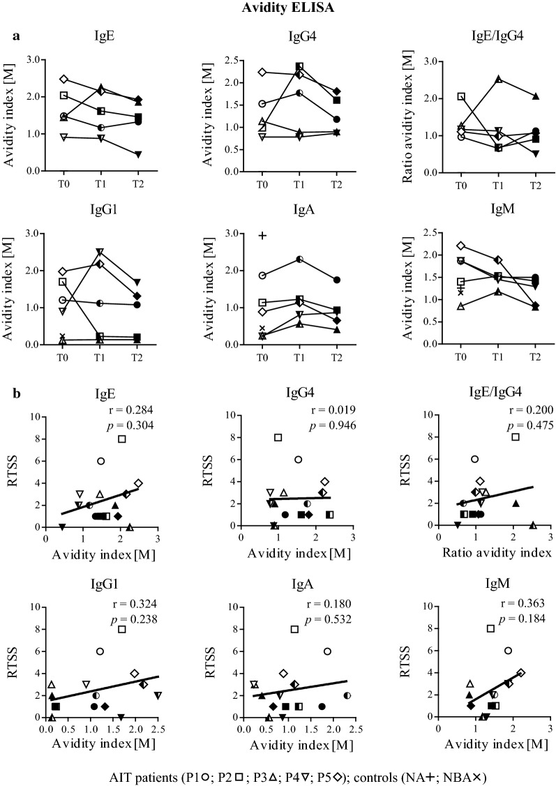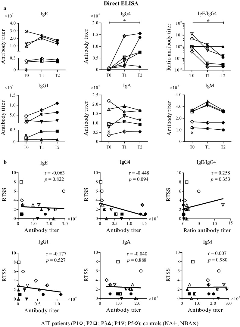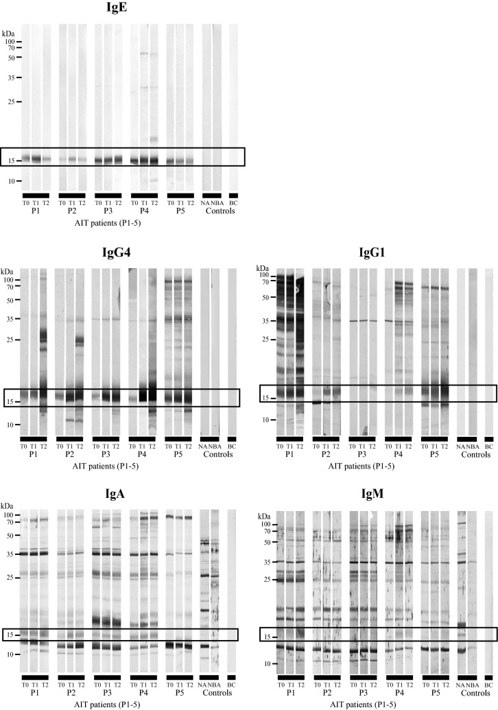 Methods: Immune responses of five birch pollen allergic patients were monitored during the first year of AIT by nasal provocation tests (NPTs), ImmunoCAP, immunoblots, direct and avidity enzyme-linked immunosorbent assays, mediator release assays, facilitated antigen binding (FAB) assays, and inhibition mediator release assays.