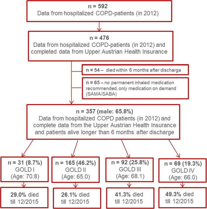 Methods: A retrospective analysis of patients hospitalized for acute exacerbation of COPD in a tertiary care hospital in Upper Austria and discharged with a guideline conform inhaled therapy was performed. Follow-up data on medical utilization was recorded for the subsequent 24 months. Adherence to inhaled therapy was defined according to the percentage of prescribed inhalers dispensed to the patient and classified as complete (> 80%), partial (50-80%) or low (< 50%).