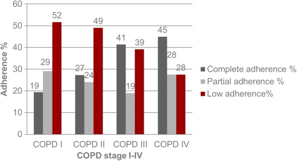 Background: COPD is a treatable disease with increasing prevalence worldwide. Treatment aims to stop disease progression, to improve quality of life, and to reduce exacerbations. We aimed to evaluate the association of the stage of COPD on adherence to inhaled therapy and the relationship between adherence and COPD exacerbations.