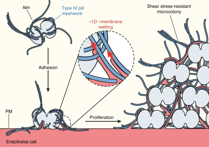 The shape of cellular membranes is highly regulated by a set of conserved mechanisms that can be manipulated by bacterial pathogens to infect cells. Remodeling of the plasma membrane of endothelial cells by the bacterium Neisseria meningitidis is thought to be essential during the blood phase of meningococcal infection, but the underlying mechanisms are unclear. Here we show that plasma membrane remodeling occurs independently of F-actin, along meningococcal type IV pili fibers, by a physical mechanism that we term 'one-dimensional' membrane wetting. We provide a theoretical model that describes the physical basis of one-dimensional wetting and show that this mechanism occurs in model membranes interacting with nanofibers, and in human cells interacting with extracellular matrix meshworks. We propose one-dimensional wetting as a new general principle driving the interaction of cells with their environment at the nanoscale that is diverted by meningococci during infection.