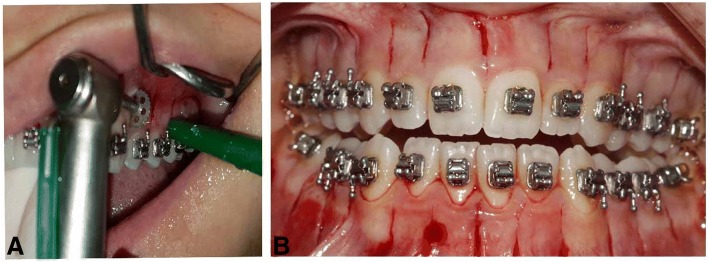 Methods: Thirty-five female individuals were included in this clinical study. The participants were classified into three groups as conventional fixed non-extraction orthodontic treatment only (OT, n = 14), piezocision in addition to fixed non-extraction orthodontic treatment (PG, n = 9), and discision in addition to fixed non-extraction orthodontic treatment (DG, n = 12). The piezocisions and discisions were performed 1 week after placement of bonding brackets. The patients were seen at 2-3 week-intervals. Initial Little's irregularity index scores were recorded from dental casts. Periodontal parameters were measured initially, after the 1-month orthodontic treatment. Probing pocket depth, bleeding on probing, plaque index, and gingival index were recorded. Visual analog scale (VAS) was performed over the first month at different times following the bracket bonding for pain assessment. The total orthodontic treatment duration was noted.
