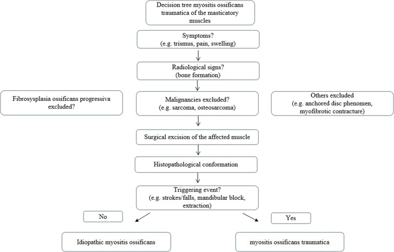 Conclusions: Dental procedures, such as local anesthesia or extractions, may cause MOT of the masticatory musculature. Demographical analyses demonstrate that females have a higher risk of developing MOT with respect to dental treatment. The most important treatment option is surgical excision. Subsequent physical therapy can have beneficial effects. Nevertheless, a benefit of interpositional materials and drugs as therapy of MOT of the masticatory muscles has not yet been proven. Myositis ossificans progressiva has to be excluded.