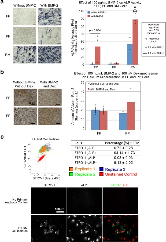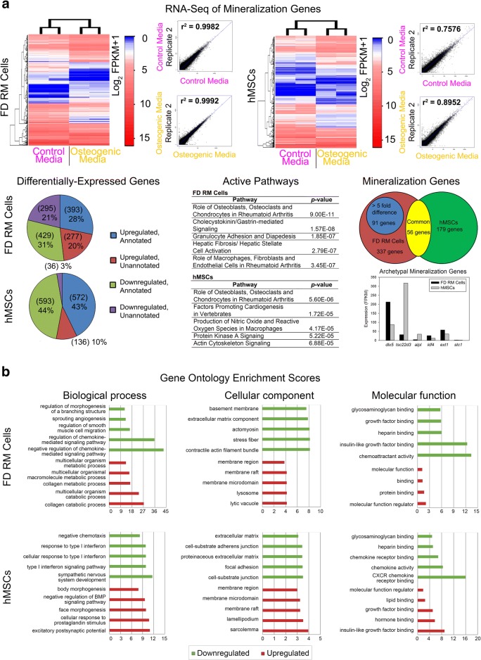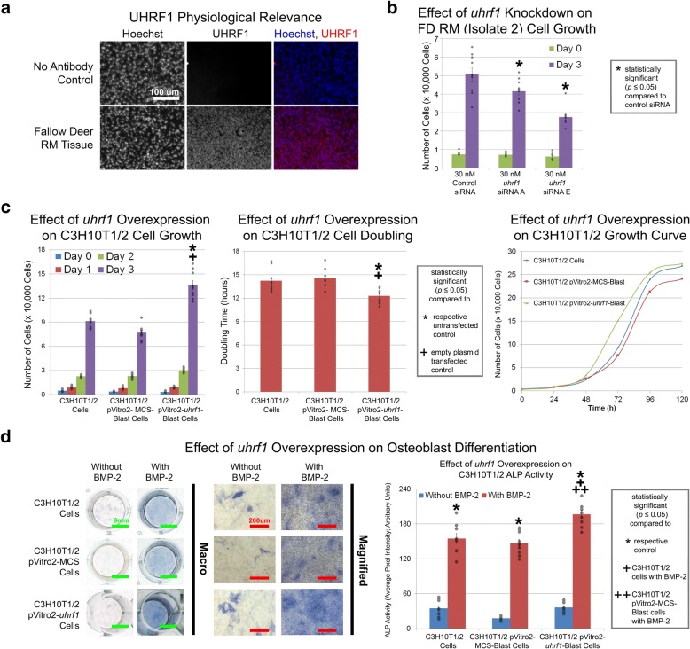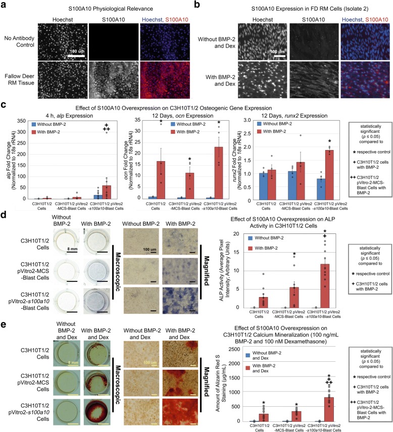 Results: Cell characterization studies showed that in vitro-cultured deer antler-derived reserve mesenchyme (RM) cells exhibited high osteogenic capabilities and cell surface markers similar to in vivo counterparts. Under identical culture conditions, deer antler RM cells proliferated faster (8.6-11.7-fold increase in cell numbers) and exhibited increased osteogenic differentiation (17.4-fold increase in calcium mineralization) compared to human mesenchymal stem cells (hMSCs), paralleling in vivo conditions. Comparative RNA-seq identified 40 and 91 previously unknown and uniquely expressed fallow deer (FD) proliferation and mineralization genes, respectively, including uhrf1 and s100a10. Immunofluorescence studies showed that uhrf1 and s100a10 were expressed in regenerating deer antlers while gene overexpression and gene knockdown studies demonstrated the proliferation contributions of uhrf1 and mineralization capabilities of s100a10.