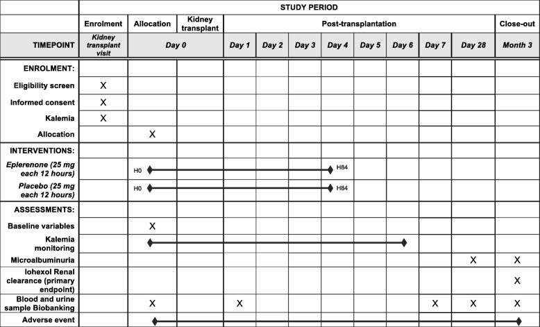 Methods/design: This is a multicenter, double-blind, placebo-controlled, randomized clinical trial. Patients on hemodialysis and undergoing a single or a dual KT from an ECD will be eligible for inclusion. We plan to randomize 132 patients. Included patients will be randomized (1:1) to receive either eplerenone 25 mg every 12 h during 4 days (the first dose being administered just prior to KT) or placebo. The primary outcome is graft function at 3 months, assessed by glomerular filtration rate (GFR, in mL/min/1.73m2) measured using iohexol clearance. Secondary outcomes include (1) proportion of patients with either dialysis dependency or a GFR < 30 mL/min/1.73m2 at 3 months, (2) proportion of patients with immediate, slow, or delayed graft function, (3) proteinuria at 3 months, (4) occurrence of hyperkalemia during the first week following KT, (5) length of hospital stay for the KT, and (6) occurrence of biopsy-proven acute rejection in the first 3 months following KT. Estimated GFR, graft, and patient survival will also be collected at 1, 3, and 10 years via the national database of organ recipients.