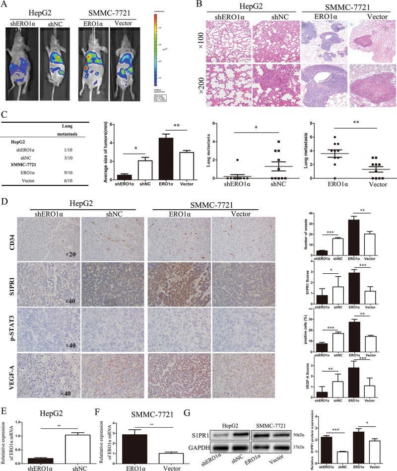 Mounting evidence demonstrates that expression of ERO1α, an endoplasmic reticulum (ER)-resident oxidase, is a poor prognosis factor in a variety of human cancers. However, the clinical relevance of ERO1α and its molecular mechanisms underlying tumor progression have not been determined for hepatocellular carcinoma (HCC). ERO1α expression levels in HCC tissues and cells were detected by quantitative real-time PCR and western blotting. ERO1α shRNAs and overexpression vector were transfected into HCC cells to downregulate or upregulate ERO1α expression. In vitro and in vivo assays were performed to investigate the function of ERO1α in invasion, metastasis, and angiogenesis of HCC. We found high ERO1α expression in HCC tissues and cells that was significantly associated with metastasis and poor clinicopathologic features of vascular invasion, advanced Edmondson Grade, and TNM stage. Loss-of-function and gain-of-function studies showed that ERO1α prompted migration, invasion, epithelial-mesenchymal transition (EMT), and angiogenesis of HCC cells both in vitro and in vivo. Further studies verified a positive correlation between ERO1α and S1PR1, upregulated in metastatic HCC tissues compared with HCC tissues without metastasis. S1PR1 knockdown markedly diminished the effects of ERO1α on HCC cell migration, invasion and vascular endothelial growth factor (VEGF) expression. Most importantly, ERO1α knockdown significantly repressed the death of HCC xenograft mouse models by reducing tumor distant metastasis, and host angiogenesis by suppressing the expression of S1PR1, p-STAT3, and VEGF-A in HCC cells. Our findings suggest that ERO1α is significantly correlated with reduced survival and poor prognosis, and promotes HCC metastasis and angiogenesis by triggering the S1PR1/STAT3/VEGF-A signaling pathway. ERO1α might be a novel candidate in HCC prognosis and therapy.