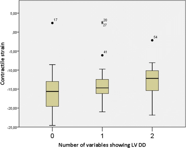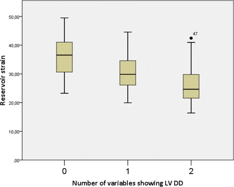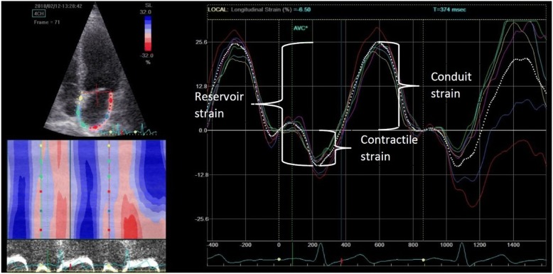 Results: Mean contractile, conduit and reservoir strains in all the patients were - 14.14 (± 5.83) %, 15.98 (± 4.85) % and 31.03 (± 7.64) % respectively. Contractile strain did not differ between the groups. Conduit strain was higher in patients with 0 signs compared with other groups (p = 0.016 vs 1 sign of LV DD and p = 0.001 vs 2 signs of LV DD). Reservoir strain was higher in patients with 0 signs compared with other groups (p = 0.014 vs 1 sign of LV DD and p < 0.001 vs 2 signs of LV DD).