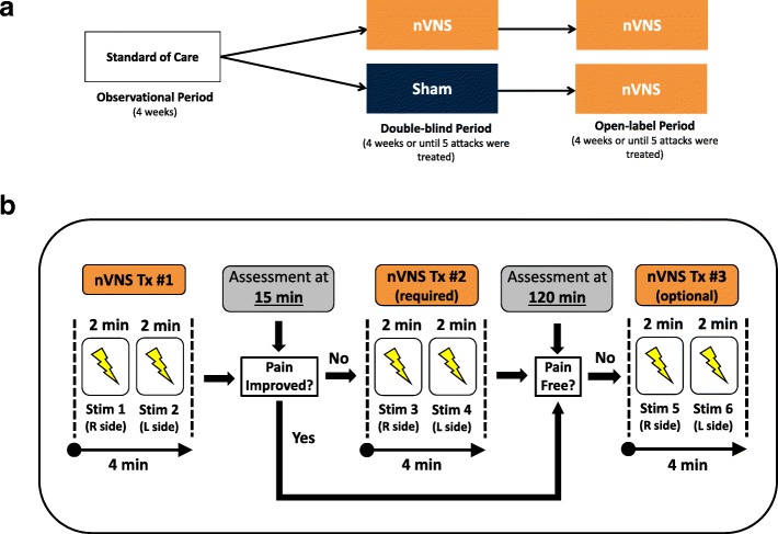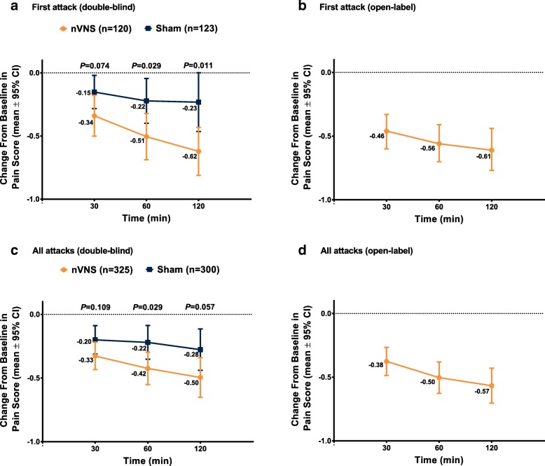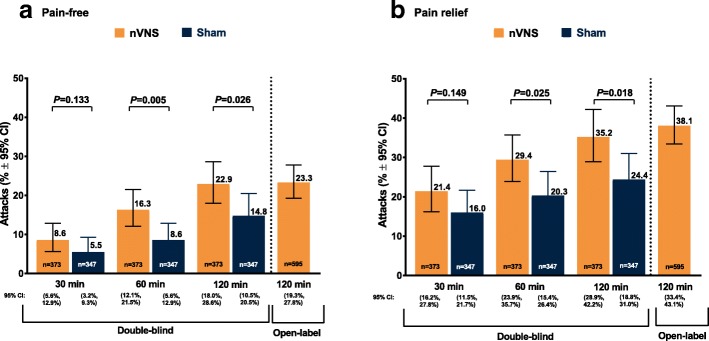 Results: The intent-to-treat population consisted of 243 patients. The nVNS group (n = 120) had a significantly greater percentage of attacks treated during the double-blind period that were pain-free at 60 (P = 0.005) and 120 min (P = 0.026) than the sham group (n = 123) did. Similar results were seen for attacks with pain relief at 60 (P = 0.025) and 120 min (P = 0.018). For the first attack and all attacks, the nVNS group had significantly greater decreases (vs sham) in pain score from baseline to 60 min (P = 0.029); the decrease was also significantly greater for nVNS at 120 min for the first attack (P = 0.011). Results during the open-label period were consistent with those of the nVNS group during the double-blind period. The incidence of adverse events (AEs) and adverse device effects was low across all study periods, and no serious AEs occurred.