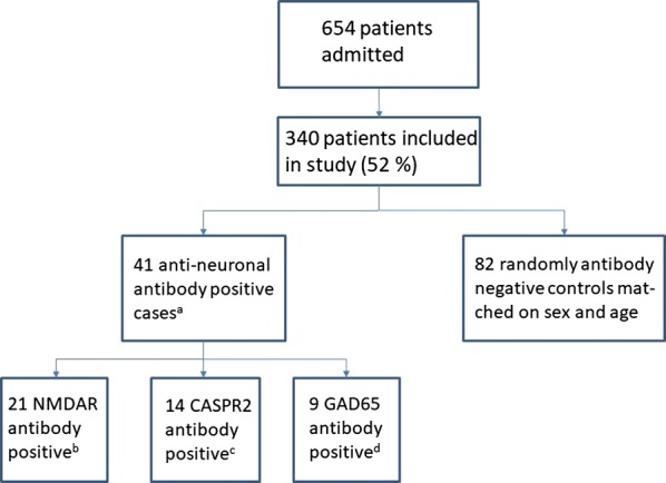 Results: Patients who were serum-positive to N-methyl D-aspartate receptor (NMDAR) (n = 21), contactin-associated protein 2 (CASPR2) (n = 14) and/or glutamic acid decarboxylase 65 (GAD65) (n = 9) antibodies (cases) were age and sex matched (1:2) with serum-negative patients from the same cohort (controls). The prevalence and severity of psychiatric symptoms frequently encountered in NMDAR, CASPR2 and GAD65 antibody associated disorders were compared in cases and controls. NMDAR, CASPR2 and GAD65 antibody positive patients did not differ in their clinical presentation from matched serum negative controls.