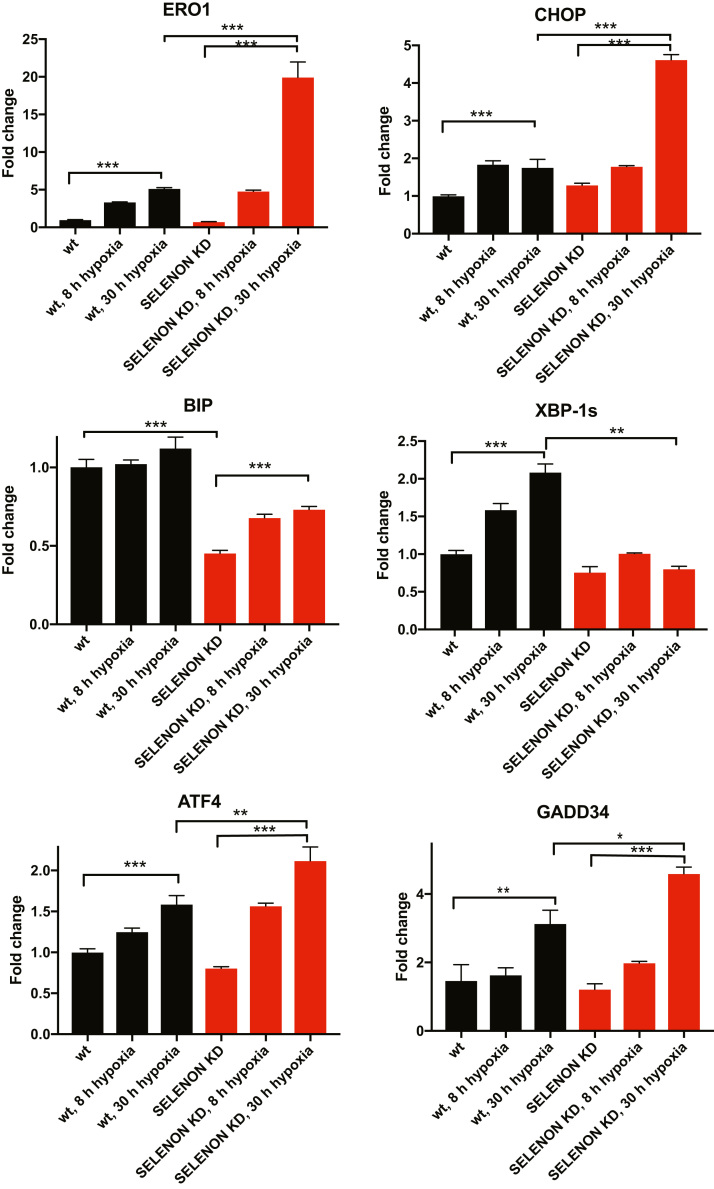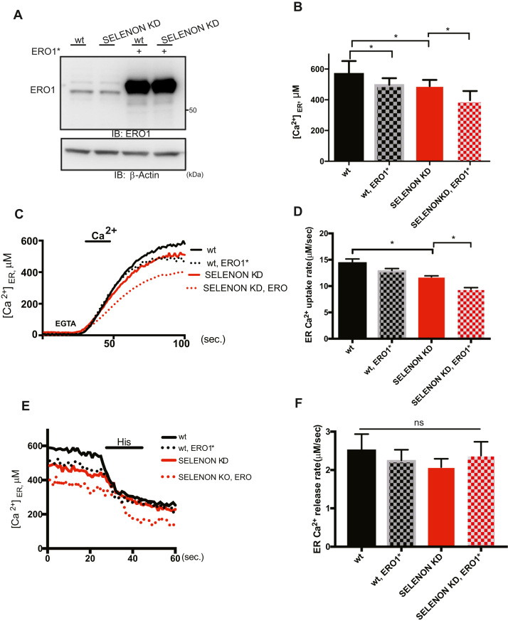 Selenoprotein N (SELENON) is an endoplasmic reticulum (ER) protein whose loss of function leads to human SELENON-related myopathies. SelenoN knockout (KO) mouse limb muscles, however, are protected from the disease, and display no major alterations in muscle histology or contractile properties. Interestingly, we find that the highly active diaphragm muscle shows impaired force production, in line with the human phenotype. In addition, after repeated stimulation with a protocol which induces muscle fatigue, also hind limb muscles show altered relaxation times. Mechanistically, muscle SELENON loss alters activity-dependent calcium handling selectively impinging on the Ca2+ uptake of the sarcoplasmic reticulum and elicits an ER stress response, including the expression of the maladaptive CHOP-induced ERO1. In SELENON-devoid models, ERO1 shifts ER redox to a more oxidised poise, and further affects Ca2+ uptake. Importantly, CHOP ablation in SelenoN KO mice completely prevents diaphragm dysfunction, the prolonged limb muscle relaxation after fatigue, and restores Ca2+ uptake by attenuating the induction of ERO1. These findings suggest that SELENON is part of an ER stress-dependent antioxidant response and that the CHOP/ERO1 branch of the ER stress response is a novel pathogenic mechanism underlying SELENON-related myopathies.
