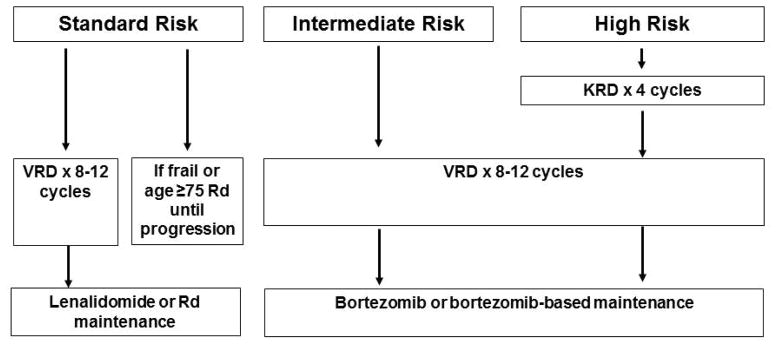 Risk-adapted initial therapy: Initial treatment consists of bortezomib, lenalidomide, dexamethasone (VRd). In high-risk patients, carfilzomib, lenalidomide, dexamethasone (KRd) is an alternative to VRd. In eligible patients, initial therapy is given for approximately 3–4 cycles followed by autologous stem cell transplantation (ASCT). Standard risk patients can opt for delayed ASCT at first relapse. Patients not candidates for transplant are treated with VRd for approximately 8–12 cycles followed by lenalidomide or lenalidomide plus dexamethasone.