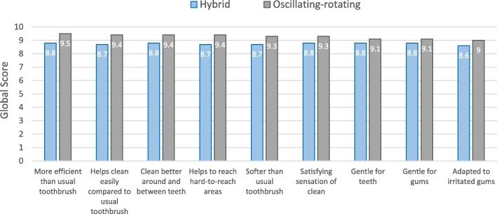 Results: After a single use, the hybrid toothbrush used in combined mode presented a global anti-plaque efficacy characterized by a significant decrease of the global PI of 45% on average (p < 0.0001; paired t-test). It was as effective as the oscillating rotating toothbrush in plaque removal (p > 0.05; unpaired t-test). The global tolerance of both toothbrushes was judged as "Good" and they were equally appreciated by the users.