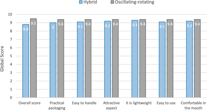 Methods: It was a randomized, examiner-blind, single-center study performed on two parallel groups: hybrid toothbrush (n = 33) versus oscillating-rotating toothbrush (n = 33). A brushing exercise was conducted for two minutes on subjects presenting a "Silness and Löe Plaque Index" (PI) between 1.0 and 2.0 and a "Modified Gingival Index" between 1.0 and 2.0. They were not to have ever used an electric toothbrush. To assess the device effect after brushing, a paired t-test was applied on the change outcome (After-Before brushing). An unpaired t-test was used to compare the efficacy of both devices. A global tolerance assessment of each powered toothbrush was done on all the subjects. The number and percentage of reactions related to each toothbrush was collected and the final tolerance assessment was estimated.